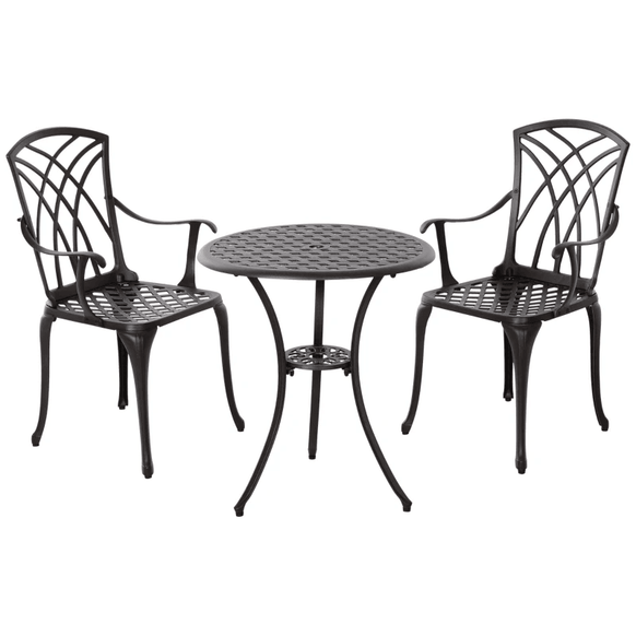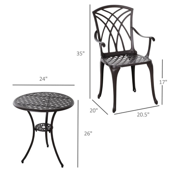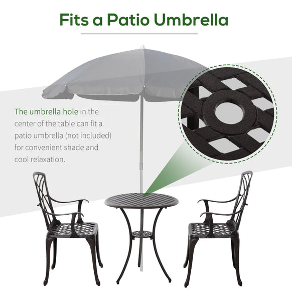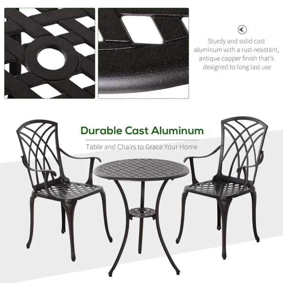 Ensemble de bistro de patio 3 pièces, ensemble de meubles de conversation d'extérieur en fonte d'aluminium, table basse avec trou pour parasol, 2 fauteuils, marron