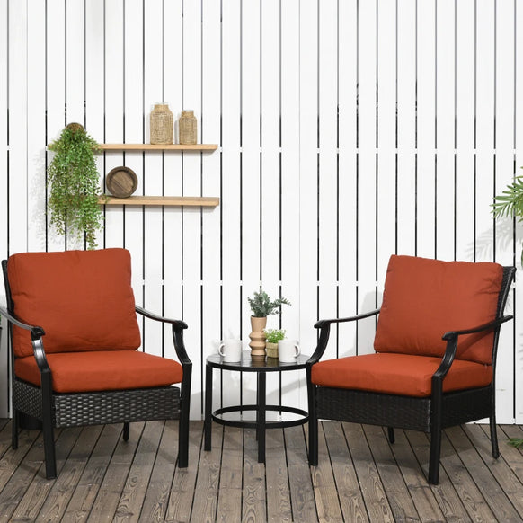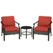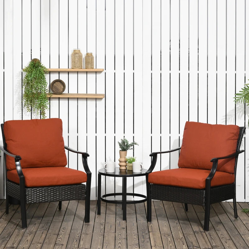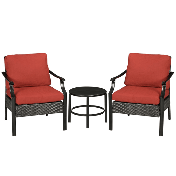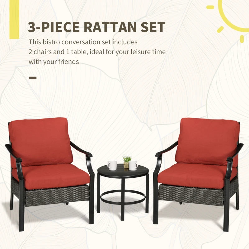 Ensemble de bistro de patio en osier 3 pièces, meubles de balcon d'extérieur en rotin PE avec coussins rembourrés doux et table en plaque de fer pour jardin, arrière-cour, rouge