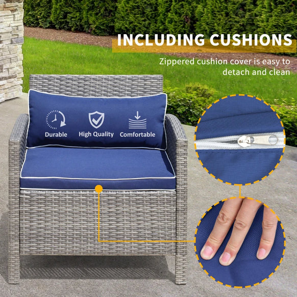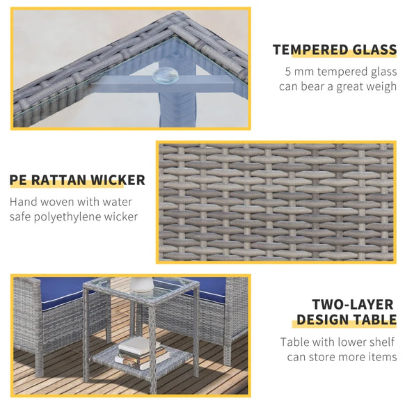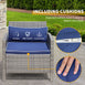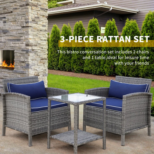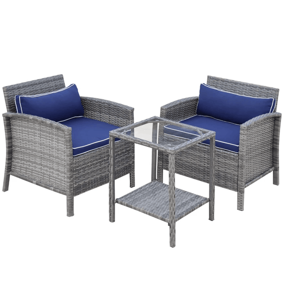 Ensemble de table basse en osier de patio 3 pièces, meubles de conversation de bistro avec coussin pour patio, cour, porche, bleu