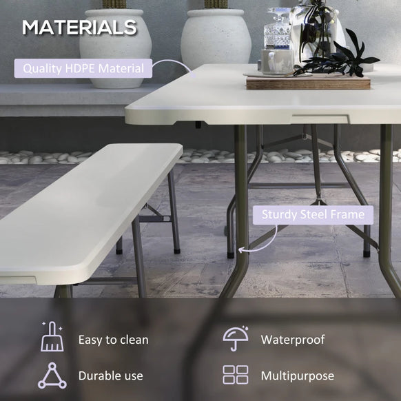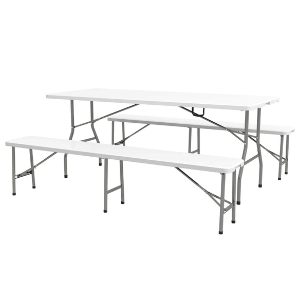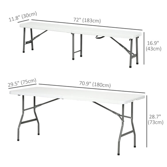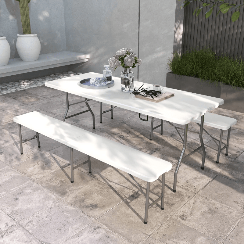 Ensemble de table de pique-nique pliante de 72 pouces, 2 bancs, 3 pièces d'extérieur en PEHD de style allemand Biergarten, table à bière pliable pour 6 personnes, blanche