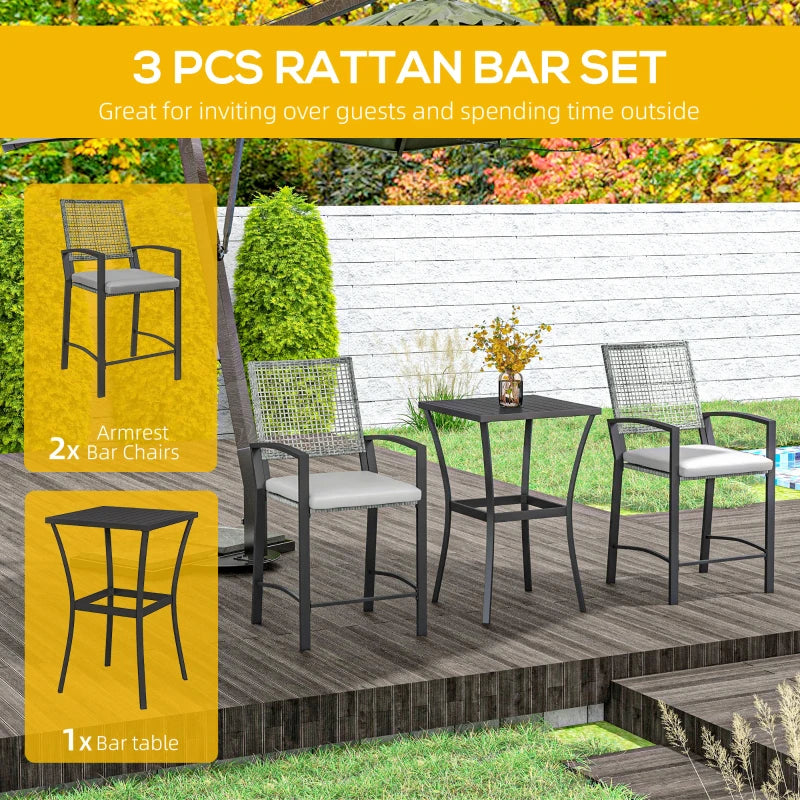 Table de bar de patio en rotin et chaises de bar avec coussins, meubles de bar pour la maison, 3 pièces