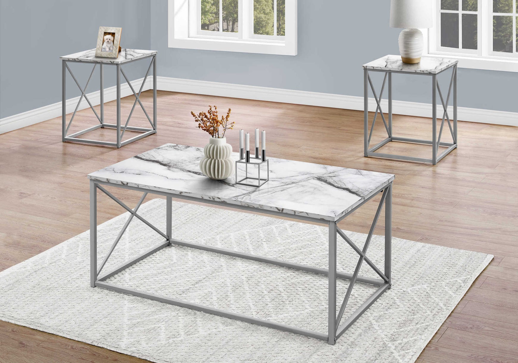 Ce bel ensemble 3 pièces sera bientôt la pièce maîtresse de votre salon. Comprenant une table basse rectangulaire et deux tables de bout, l'ensemble de table de salon comprend un plateau de table lisse d'apparence marbre blanc, habillant le décor de votre salon comme jamais auparavant. Grâce à un riche cadre en métal argenté en X très robuste, les 3 tables se fondront dans presque tous les décors et sont parfaites pour les cadres photo, les plantes et autres décorations.