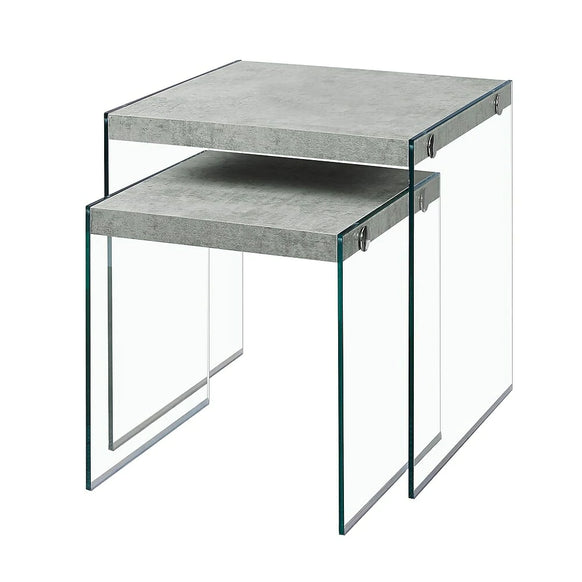 Doté d'une surface d'aspect ciment gris chic, cet ensemble de 2 tables gigognes carrées ajoute un style exceptionnel à n'importe quelle pièce. La base en verre trempé unique offre un support solide ainsi qu'un look contemporain. Utilisez cet ensemble multifonctionnel comme tables de bout, pieds de lampe, présentoirs décoratifs ou simplement comme pièces d'appoint dans votre salon, votre salle familiale, votre coin-détente ou votre bureau.