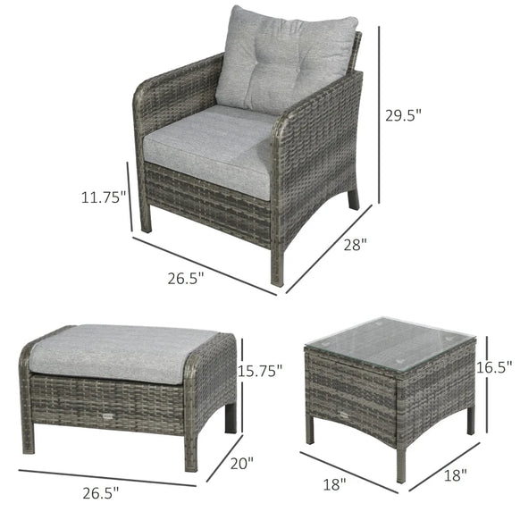 - Dimension décente : Dimension de la table : 18,25"Lx18,25"Lx16,5"H, Dimension du pouf : 26,5"Lx20"Lx15,75"H, Dimension du fauteuil : 28"Lx26,5"Lx29,5"H.
