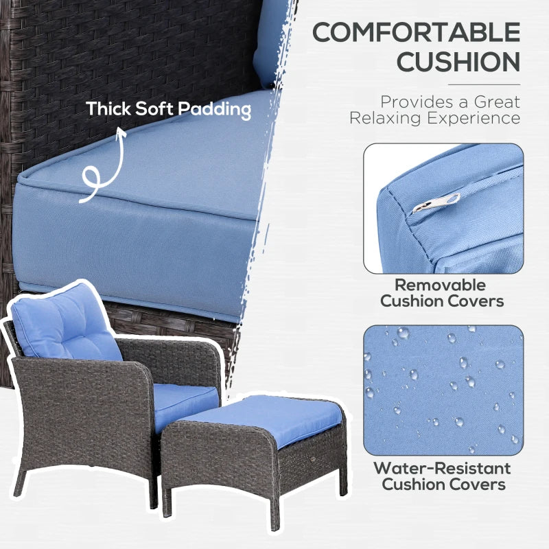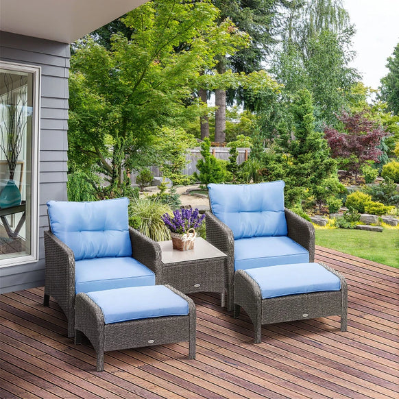 Ensemble de café de patio en rotin 5 pièces, ensemble de bistro de jardin en osier avec pouf, canapé de cour, ensemble de conversation, fauteuils, table à thé et repose-pieds avec coussins, meubles de terrasse tous temps, bleu