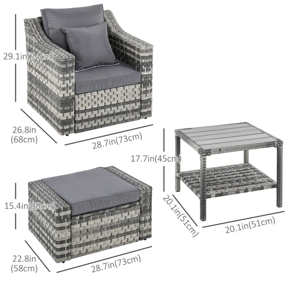 - Informations sur les meubles d'extérieur en rotin : Fauteuils : 30,25" L x 26,75" P x 29,25" H. Repose-pieds : 30,25" L x 22,75" P x 15,25" H. Table : 20" L x 20" L x 17,75" H. Capacité de poids : 352 lb (canapé/repose-pieds). 110 lb (assemblage de la table basse requis).