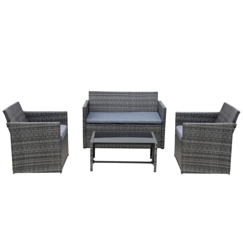 Ensemble de meubles de patio de 4 pièces avec coussins, PE Outdoor PE Rouleau Conversation de conversation Sofa Garden avec chaises à 2 places et table basse en verre, gris