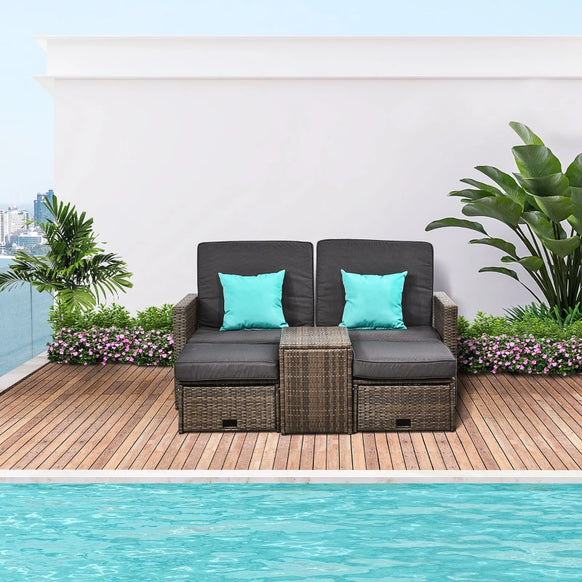 Ensemble de meubles de patio en osier 5 pièces avec coussins, ensemble de canapé d'extérieur en rotin PE avec chaise longue réglable, table basse de rangement, poufs, gris foncé