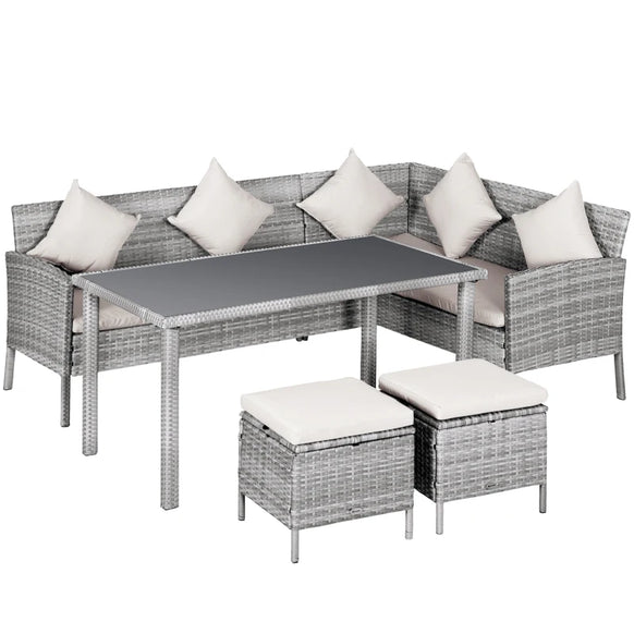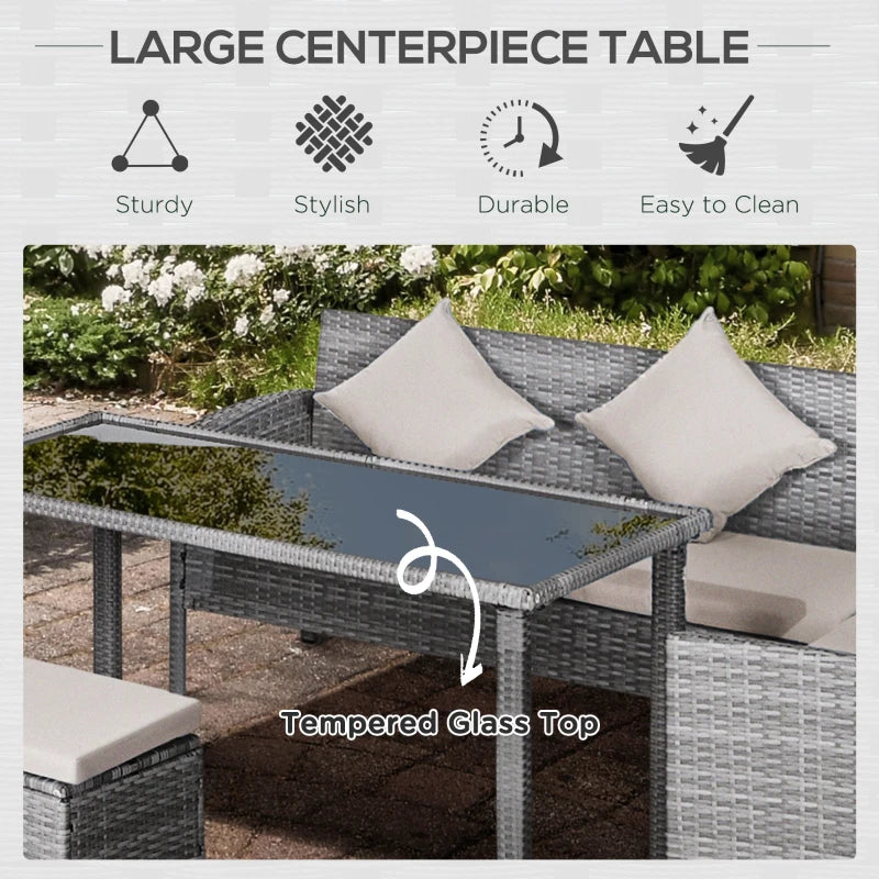 - Ensemble de salle à manger fonctionnel : Cet ensemble de canapés sectionnels est livré avec une longue table rectangulaire en rotin avec un plateau en verre trempé et deux repose-pieds assortis qui créent une pièce maîtresse pour l'ensemble de conversation sur le patio, mais ils peuvent également être utilisés indépendamment.