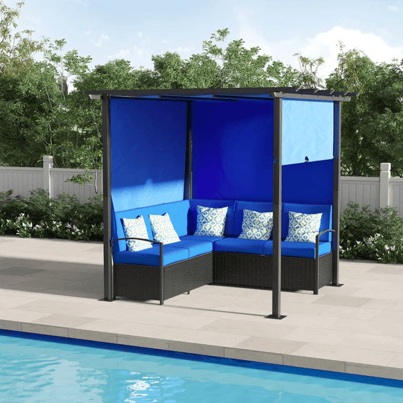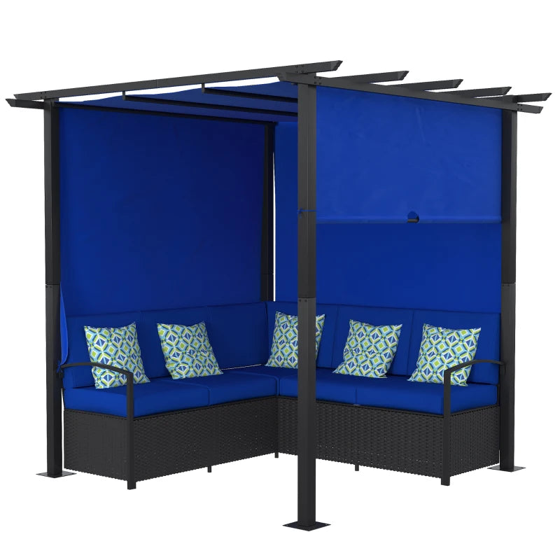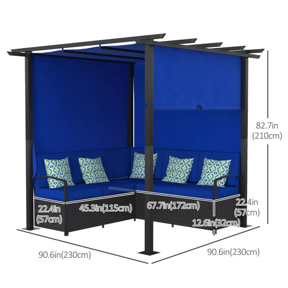 Meubles de patio en osier, ensemble de canapé d'extérieur en rotin PE avec pergola à auvent rétractable, abri d'ombrage pour terrasse, piscine, jardin, terrasse, bleu