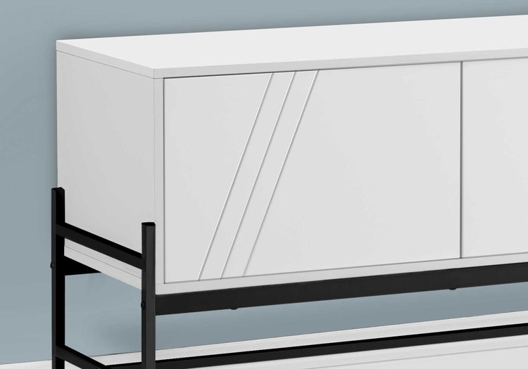 - Ce meuble TV contemporain et élégant de 60 pouces est solidement construit avec du stratifié blanc et du métal noir pour une touche moderne dans un salon, une chambre ou un bureau.