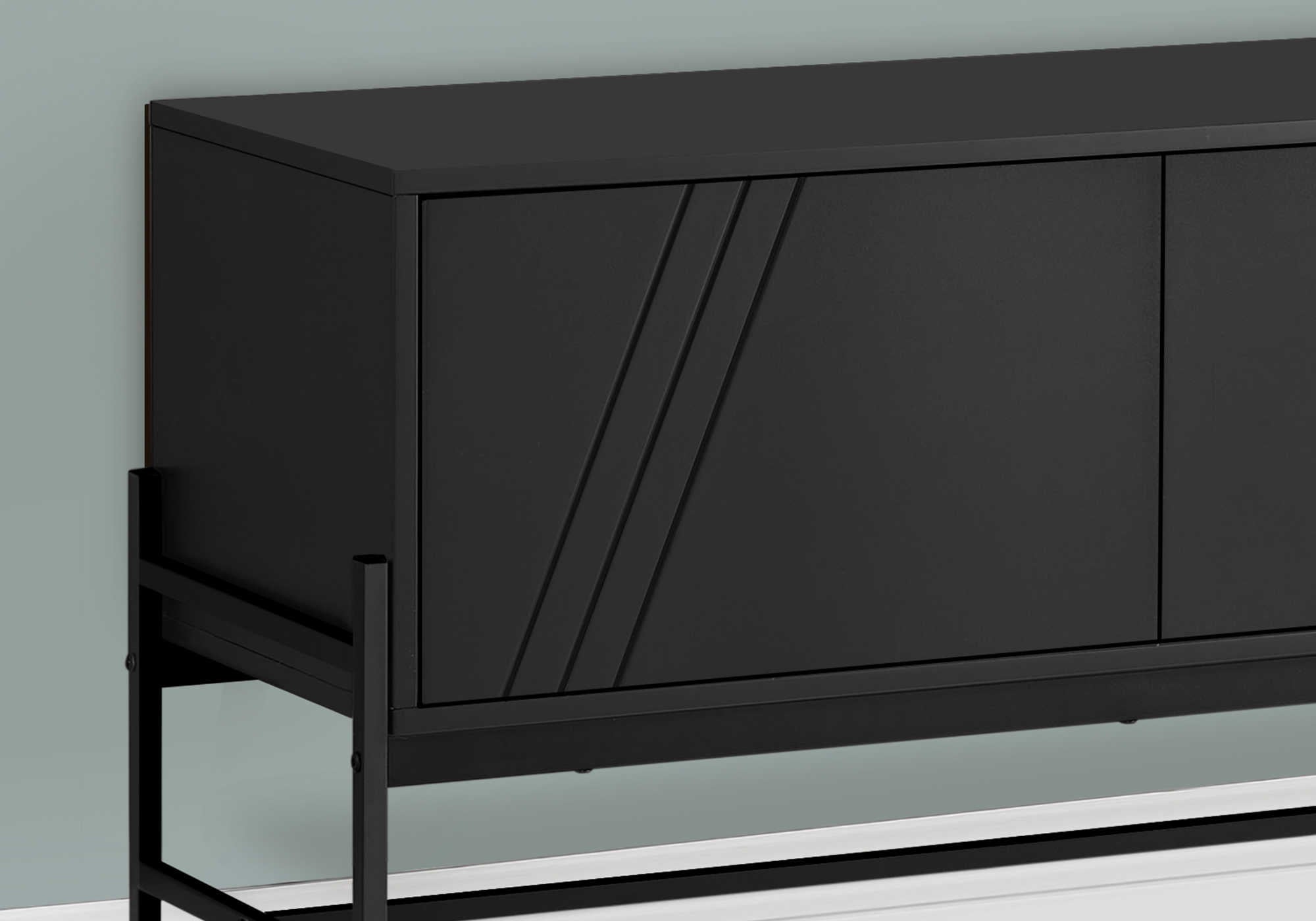 - Ce meuble TV contemporain et élégant de 60 pouces est solidement construit en stratifié noir et en métal noir pour une touche moderne dans un salon, une chambre ou un bureau.