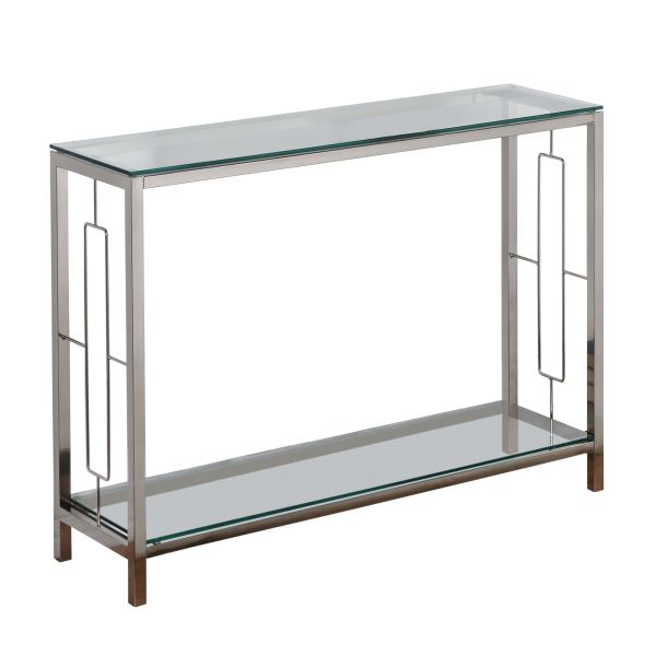 Une belle finition chromée et des étagères en verre transparent s'associent pour créer une table moderne qui est la pièce d'accent parfaite dans n'importe quelle pièce. Deux niveaux pour un espace de stockage supplémentaire. Utilisez cette table dans un couloir, une salle à manger ou une entrée avant.