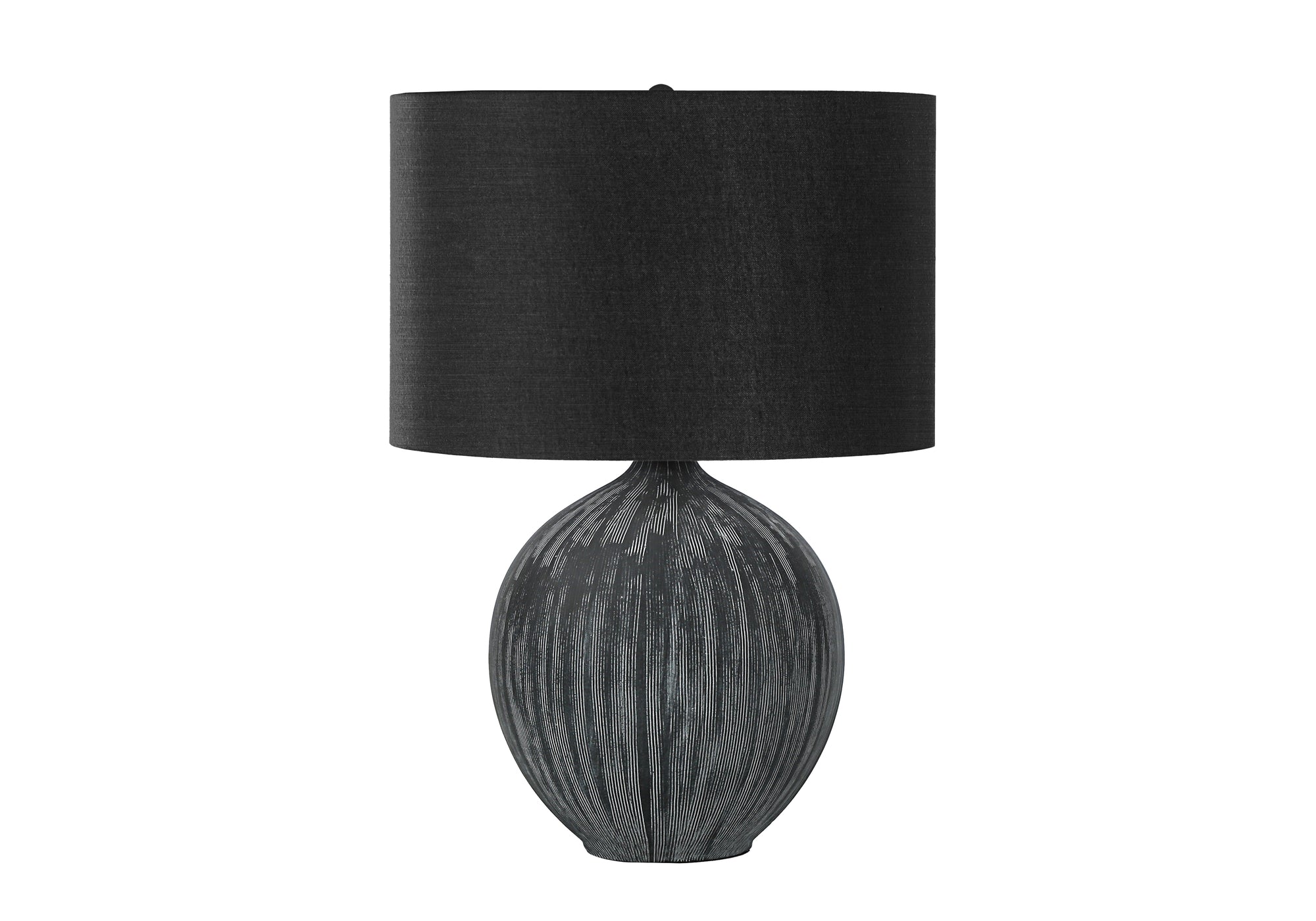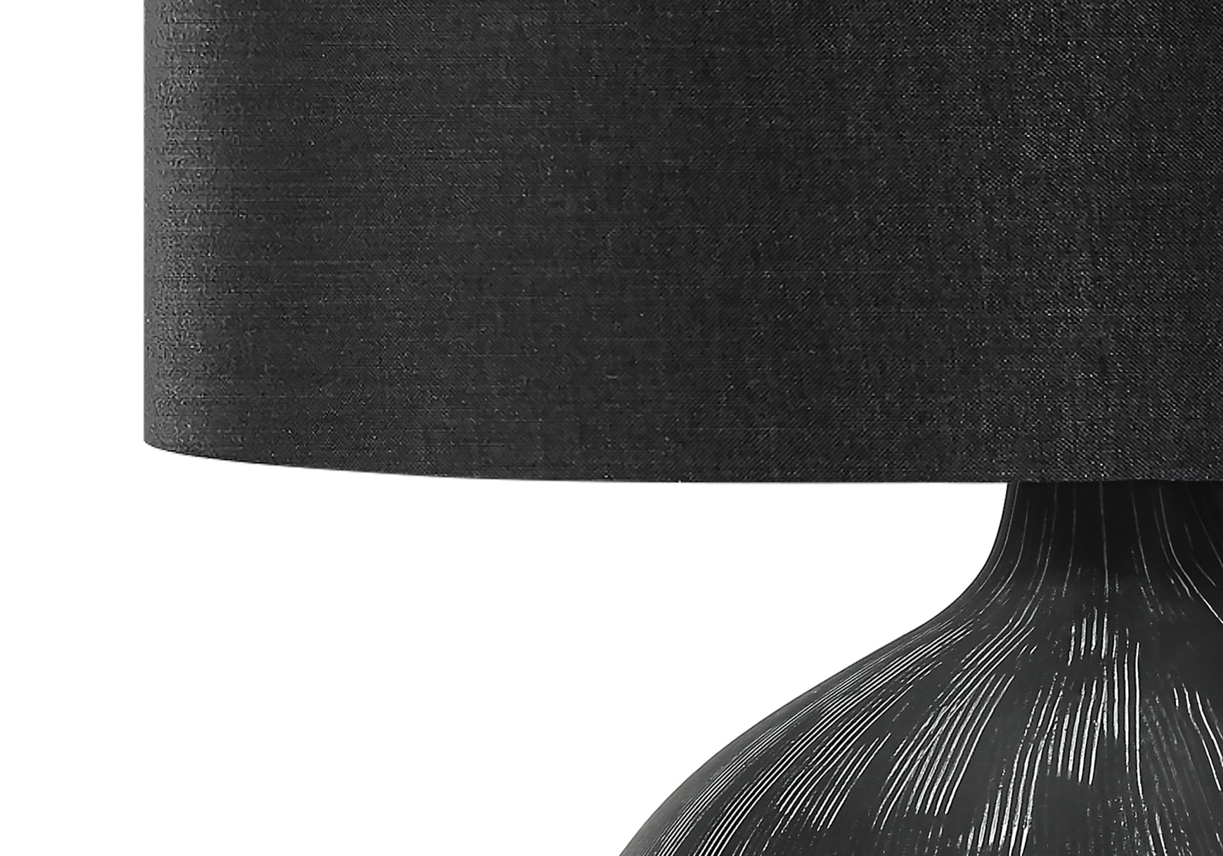 - Avec un design audacieux et contemporain, cette lampe de table de 23 po avec une base texturée en céramique noire, un grand abat-jour en tissu noir terminé par un embout rond noir sur le dessus, ajoutera du style à n'importe quelle pièce.