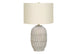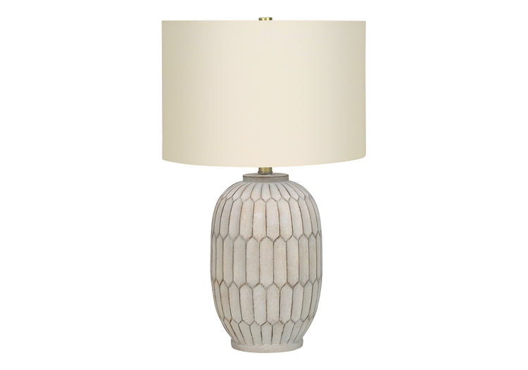- Conçue en forme de vase, cette lampe de table en résine gris crème texturée de 24 pouces surmontée d'un abat-jour tambour en lin ivoire et finie avec un fleuron doré sur le dessus, apportera un style tendance et éclectique à n'importe quel salon, chambre ou espace de bureau. .