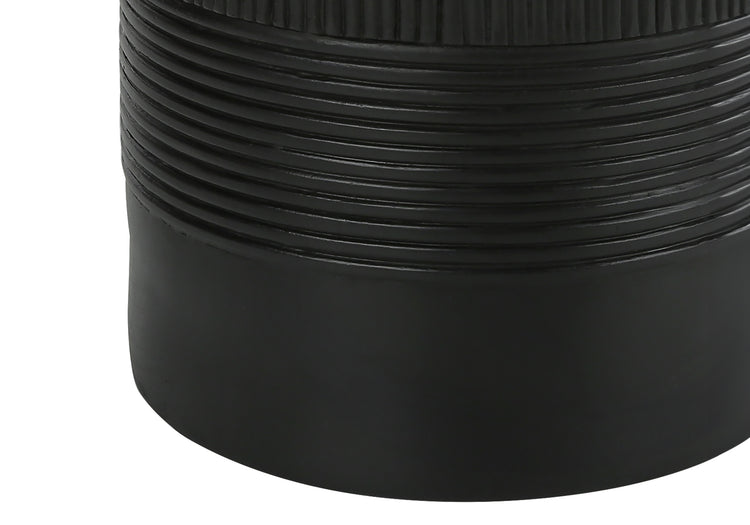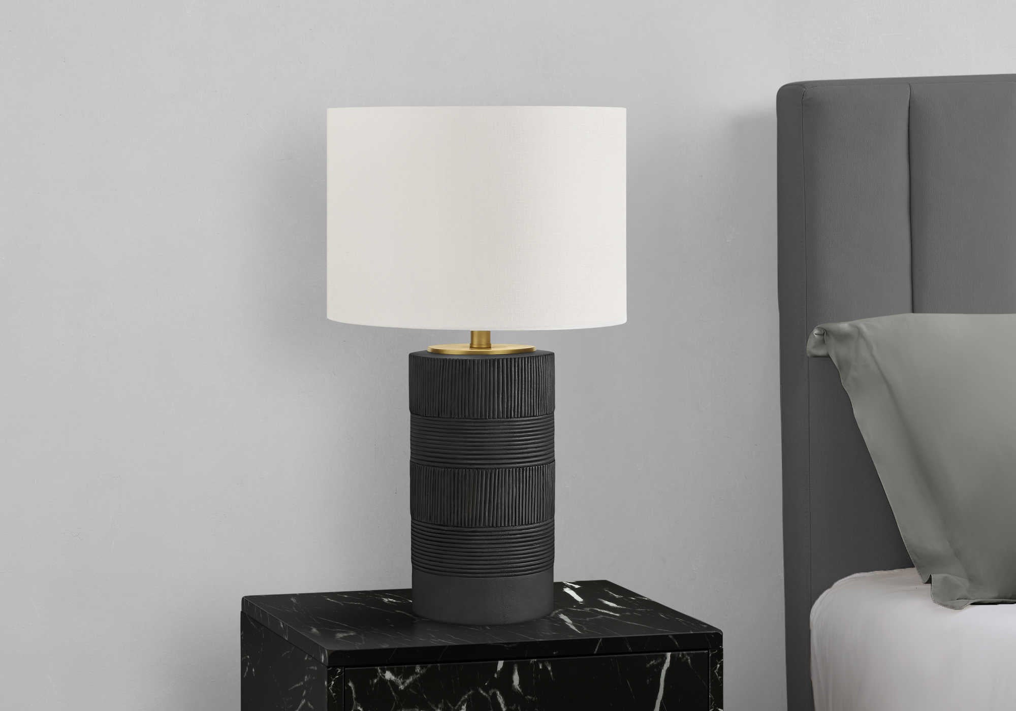 - Invitez un style tendance et audacieux dans votre salon, bureau ou chambre à coucher avec cette lampe de table contemporaine en forme de cylindre de 24 po de hauteur avec une base en résine noire texturée et un abat-jour en tissu ivoire, fini avec un fleuron rond doré sur le dessus.