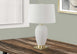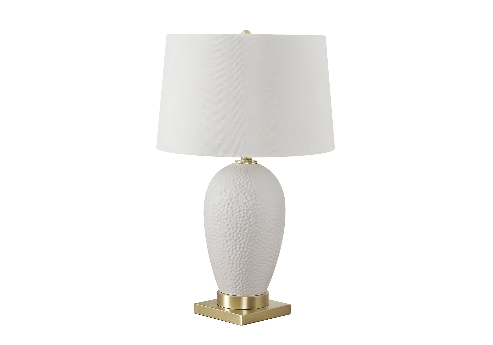- Élevez votre maison avec cette lampe de table en céramique blanche de 26 po de style transitionnel avec une finition texturée et un élégant fleuron et une base en métal doré attachée à un cordon transparent de 6 pieds de long.