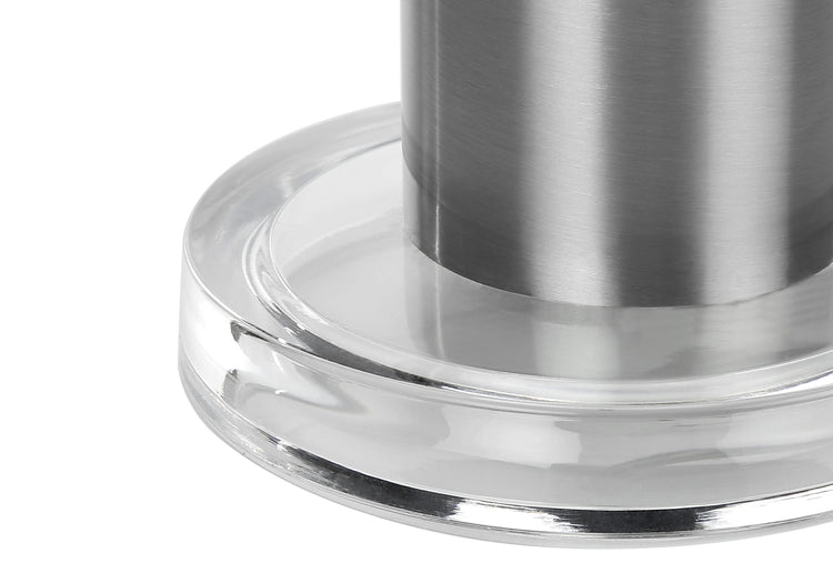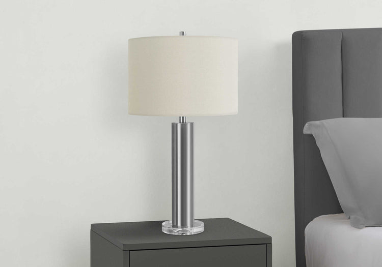 - Cette lampe de table contemporaine et élégante de 28 po est conçue avec un corps cylindrique en métal nickel accrocheur installé dans une base en acrylique transparent circulaire, surmontée d'un abat-jour tambour en lin ivoire chic et fini avec un fleuron argenté.