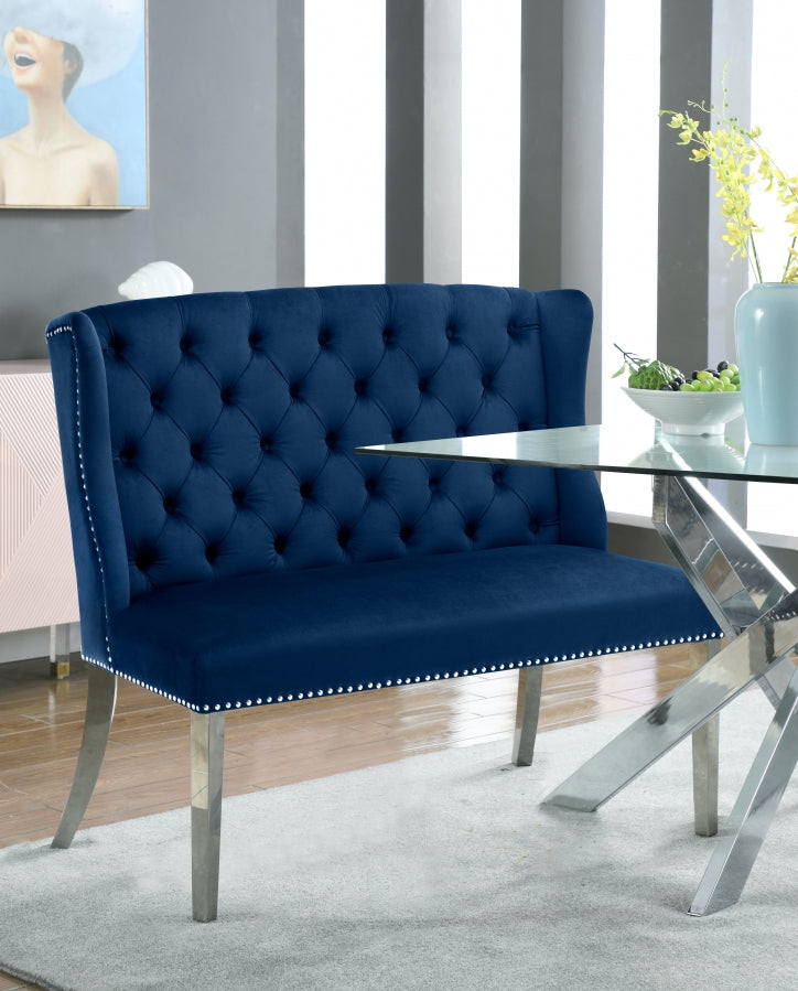 Faites en sorte qu'un invité se sente comme un MVP avec ce banc en velours Suri. Cette chaise est dotée d'un revêtement en velours bleu doux, svelte au toucher et élégant contre la peau. Le capitonnage profond du dossier ajoute une touche d'élégance et de richesse au look de cette chaise, tandis que les têtes de clous chromées et les pieds en acier inoxydable chromé lui confèrent une touche moderne et contemporaine définitive.