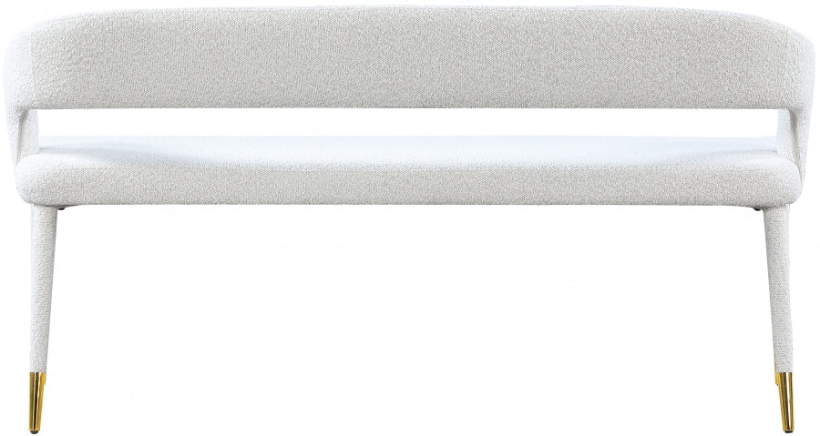 Profitez d'un espace de siège supplémentaire dans votre maison avec ce banc bouclé crème Destiny. Son rembourrage bouclé doux et crème offre un confort tout en étant assis, vous assurant que vous et vos invités sont toujours à l'aise. Un dos arrondi et ouvert offre un confort supplémentaire ainsi que du style. Les pieds rembourrés à pointe dorée donnent à ce banc une touche de style supplémentaire qui complète tout l'espace de vie contemporain. Sa grande longueur garantit que vous aurez toujours de l'espace supplémentaire pour asseoir la famille et les amis qui vous rendront visite.