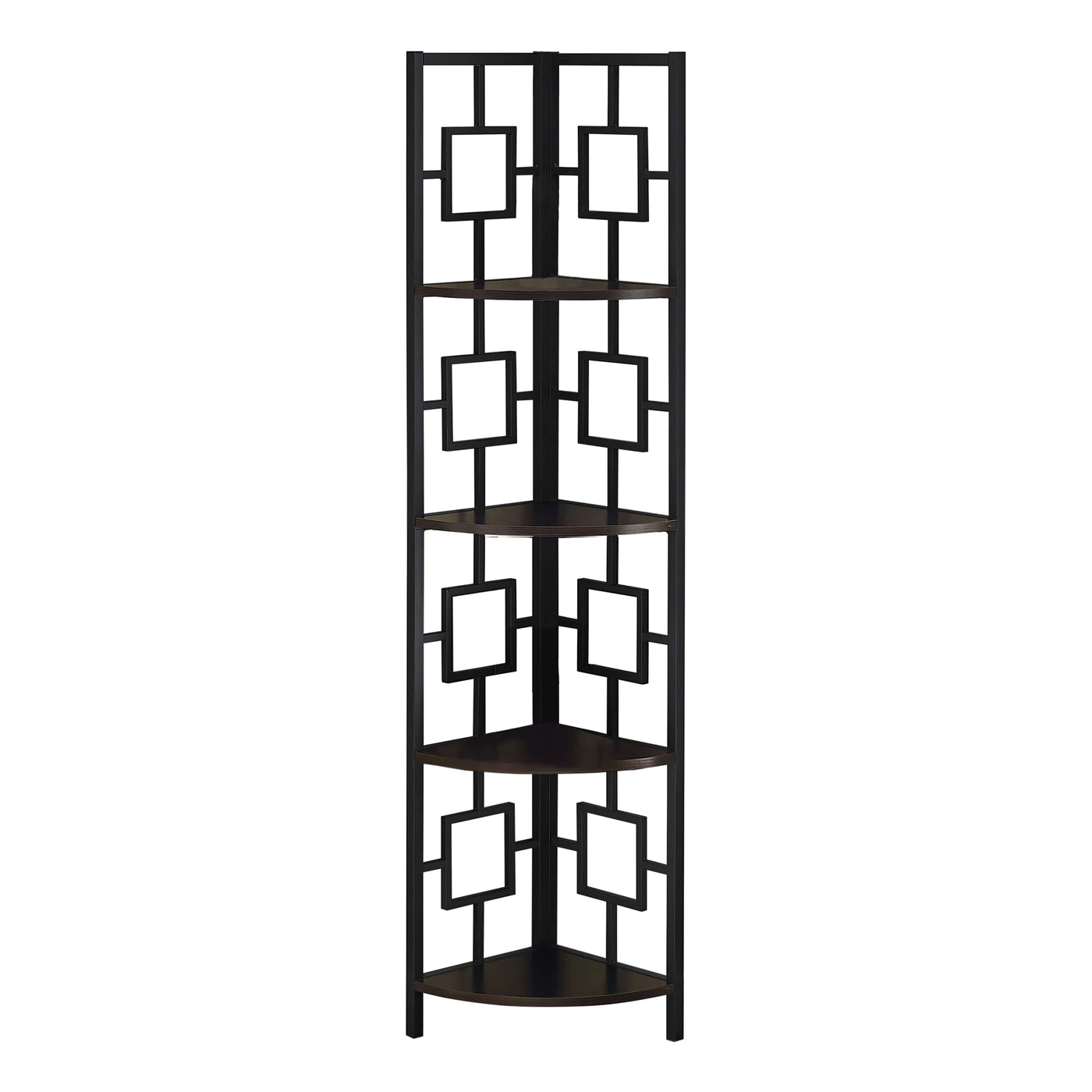 Laissez cette élégante armoire d'angle conquérir l'encombrement de votre petite maison, appartement ou condo en fournissant 4 étagères de présentation marron foncé solides qui sont parfaites pour les cadres photo, les plantes, d'autres objets décoratifs et même les accessoires de cuisine . Parfaite pour désencombrer, cette armoire d'angle en métal noir présente un design transitionnel qui rehaussera l'apparence de votre salon, chambre, cuisine ou bureau. Cette pièce de rangement décorative en pièce ajoute une touche d'élégance à n'importe quelle pièce de votre maison.