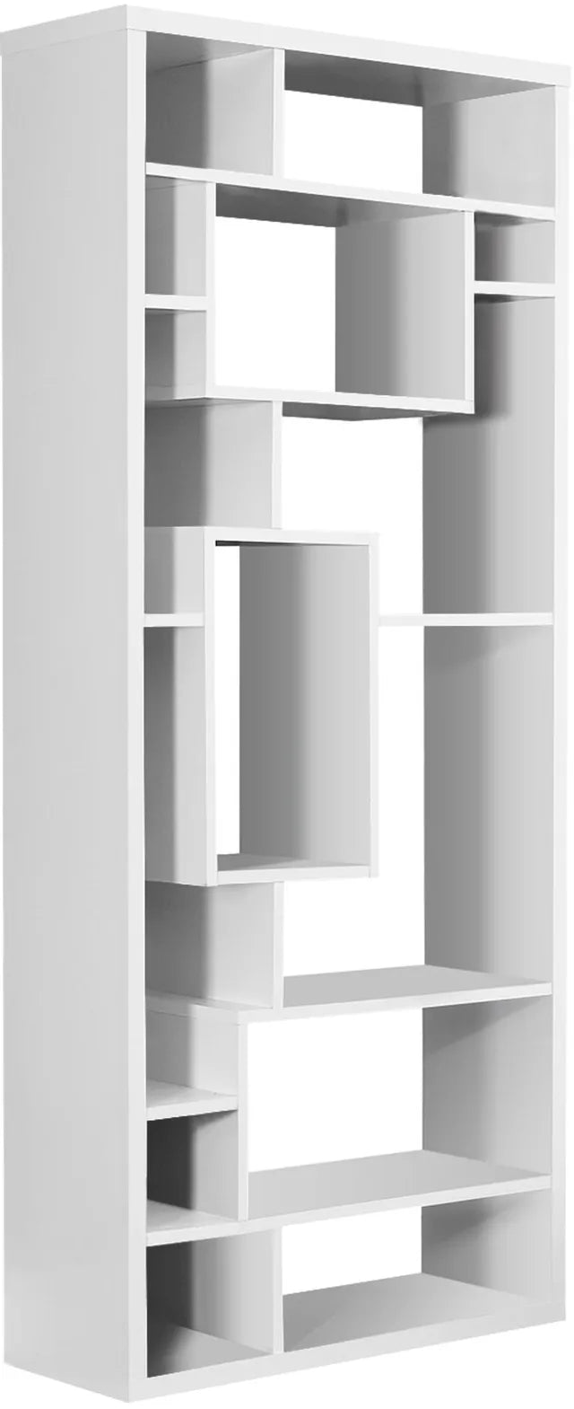 Donnez à votre maison et à votre bureau un look audacieux et moderne avec cette bibliothèque blanche lisse unique de 72 po de haut, avec des panneaux épais. Cette unité de rangement chic et sans dossier comprend 14 étagères asymétriques de tailles différentes, parfaites pour afficher vos livres, photos ou autres objets décoratifs préférés. Fini sur tous les côtés, vous pouvez placer cette bibliothèque contre n'importe quel mur ou la placer sur le côté pour l'utiliser comme séparateur de pièce pour plus de polyvalence.