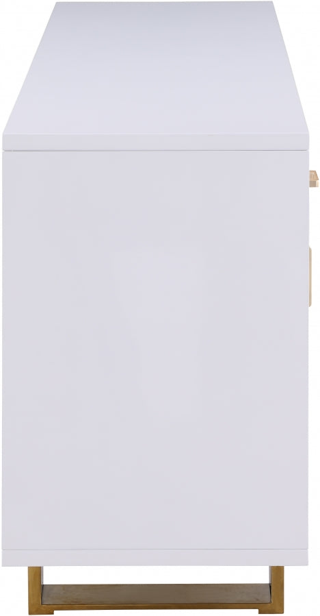 Organisez les couverts et l'argenterie dans les trois tiroirs spacieux de ce buffet buffet Excel. Ce buffet costaud offre amplement d'espace pour ranger les choses dont vous avez besoin dans la salle à manger, à l'abri des regards et des pensées. La riche finition laquée blanche avec base et poignées dorées donne à cette unité le panache moderne nécessaire pour s'intégrer à presque tous les ensembles de salle à manger contemporains. La construction en bois et en acier inoxydable assure une beauté durable et des performances durables.