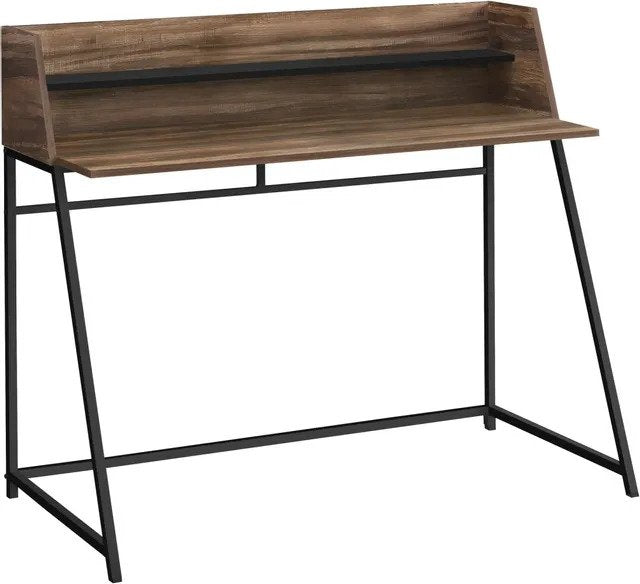 Regardez votre bureau à domicile sous un angle différent avec ce bureau d'ordinateur doté d'une huche de rangement. Fini dans un marron stratifié d'aspect bois récupéré, le bureau compact à des panneaux latéraux qui s'inclinent pour s'aligner parfaitement avec les pieds en métal attrayants de forme trapézoïdale pour un look épuré. La huche comprend 1 longue étagère dans une finition noire contrastante qui est la taille idéale pour contenir de petits objets comme des haut-parleurs sans fil ou un bloc de notes autocollantes. Le bureau est soutenu par une base métallique robuste en noir avec une barre de support à l'arrière parallèle à l'étagère. Cet ordinateur portable ou table d'écriture contemporaine au design peu encombrant est un excellent choix si vous utilisez votre salon ou votre chambre comme bureau à domicile.