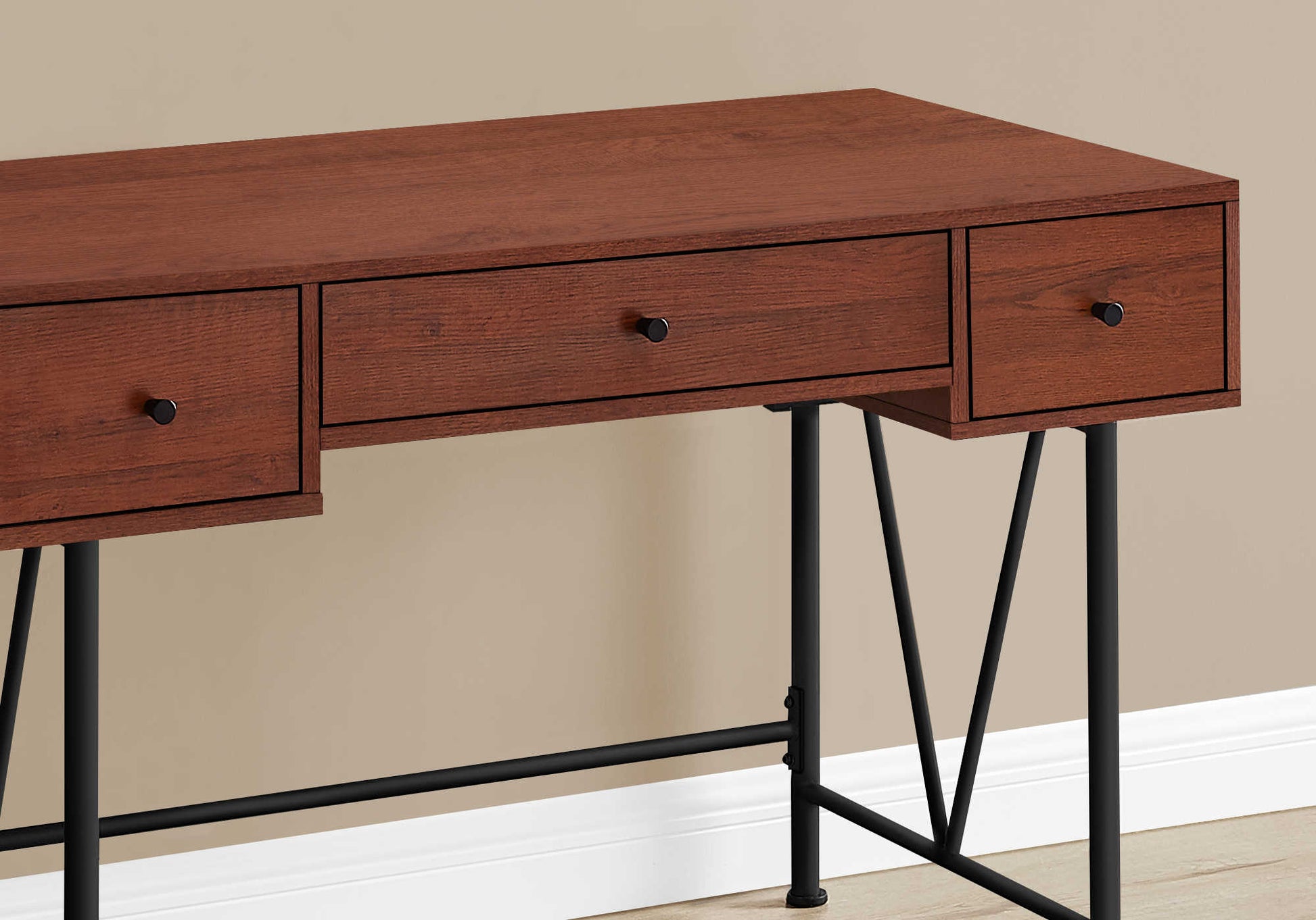 L'industrie rencontre le charme rustique dans ce bureau d'ordinateur au design contemporain très fonctionnel. Rehaussé de solides pieds en métal noir avec une conception intérieure en forme de V et offrant beaucoup de rangement qui comprend deux tiroirs latéraux avec des poignées en métal noir et un grand tiroir central sur des glissières en métal lisse. Fini sur tous les côtés dans une finition cerise chaleureuse, ce bureau peut facilement contenir votre ordinateur, votre ordinateur portable et d'autres éléments essentiels de bureau. Ce bureau d'ordinateur élégant se dévoilera, que vous le placiez dans votre salon, votre salle familiale ou votre bureau à domicile.