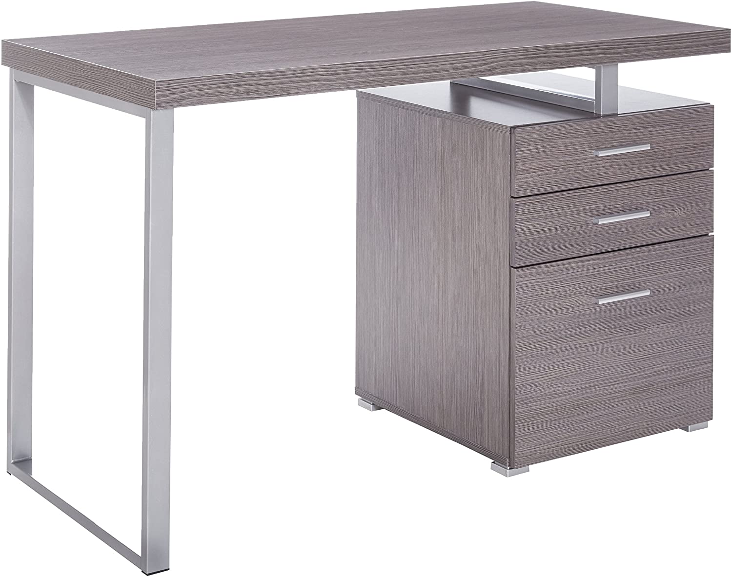 Maximisez l'espace de votre bureau à domicile et votre productivité avec ce bureau d'ordinateur avec 3 tiroirs de rangement. Le bureau flottant à panneau épais offre de la place pour l'essentiel dont vous avez besoin pour travailler et vous permet d'utiliser le dessus du bloc-tiroirs comme surface supplémentaire. Fini dans le même stratifié gris que le bureau, l'unité à tiroirs comprend 2 petits tiroirs et 1 grand tiroir avec une barre pour les dossiers suspendus et offre de l'espace pour les articles que vous souhaitez éventuellement garder hors de la surface de travail. L'unité de tiroir est réversible et peut être installée sur le côté gauche ou droit selon votre préférence. Le bureau est soutenu par un pied en métal au fini argenté avec une forme en U moderne et élégante.