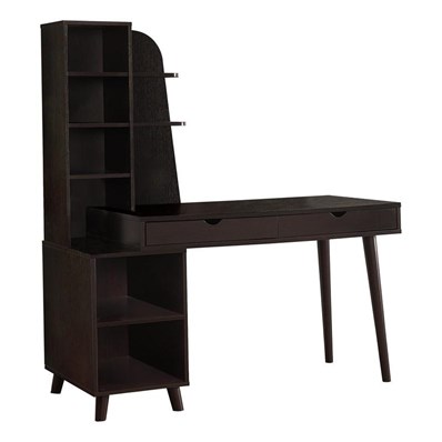 Voici une solution tout-en-un élégante et pratique pour construire votre bureau à domicile ou votre centre d'étude ! Ce bureau d'ordinateur moderne d'inspiration rétro avec une bibliothèque attachée sur le côté (non réversible) dispose de plusieurs options de rangement pour vos besoins de travail quotidiens. La surface de bureau rectangulaire lisse et spacieuse offre suffisamment d'espace pour votre ordinateur portable, une lampe et des fournitures de bureau, ainsi que 2 grands tiroirs de rangement pour ranger le matériel d'écriture. Les 7 étagères ouvertes fixes sont disponibles dans une variété de tailles en tant qu'unité de stockage facilement accessible. L'ensemble du poste de travail est soutenu par des pieds inclinés en bois massif épais et fini dans un riche espresso brun foncé à l'aspect bois sur le devant et les côtés. L'assemblage est nécessaire.