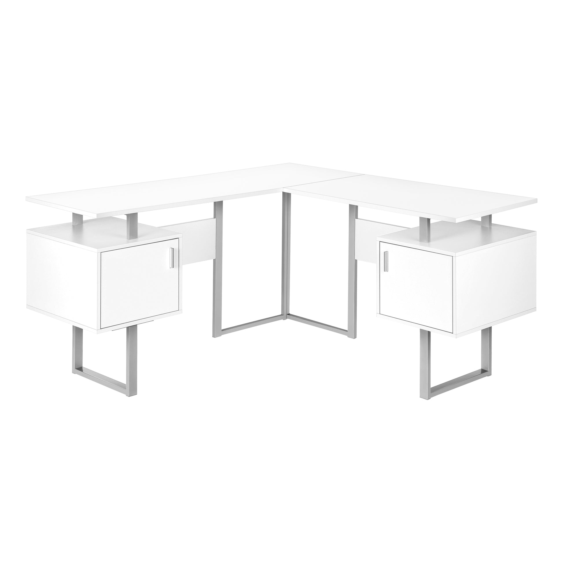 Apportez la grandeur à votre espace de travail avec une version mise à jour de ce bureau d'ordinateur réversible en forme de L de style Mid-Century. Étalez votre travail sur le vaste bureau flottant qui peut facilement accueillir un écran d'ordinateur ou un ordinateur portable, le tout soutenu par de solides pieds en métal argenté en forme de U. Fini dans un stratifié blanc brillant sur tous les côtés, y compris à l'intérieur des armoires, ce bureau d'angle élégant peut être placé n'importe où dans une pièce pour un bureau très chic. Les deux armoires fermées rehaussées de poignées en métal argenté comprennent une tablette ajustable pour ranger à portée de main les documents importants et les fournitures de bureau. Ce bureau peut facilement être inversé pour installer le côté le plus long à gauche ou à droite, ce qui vous donne une plus grande flexibilité pour organiser votre bureau à domicile en fonction de vos besoins. Les instructions de montage complètes sont incluses.