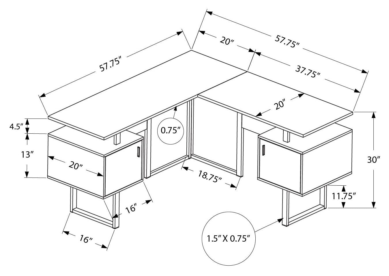 - Assemblage requis : des instructions illustrées et tout le matériel sont fournis pour plus de commodité (des outils supplémentaires peuvent être nécessaires) ; dimensions du produit : 57,75 po L x 57,75 po L x 30 po H ; profondeur du bureau : 20 po.