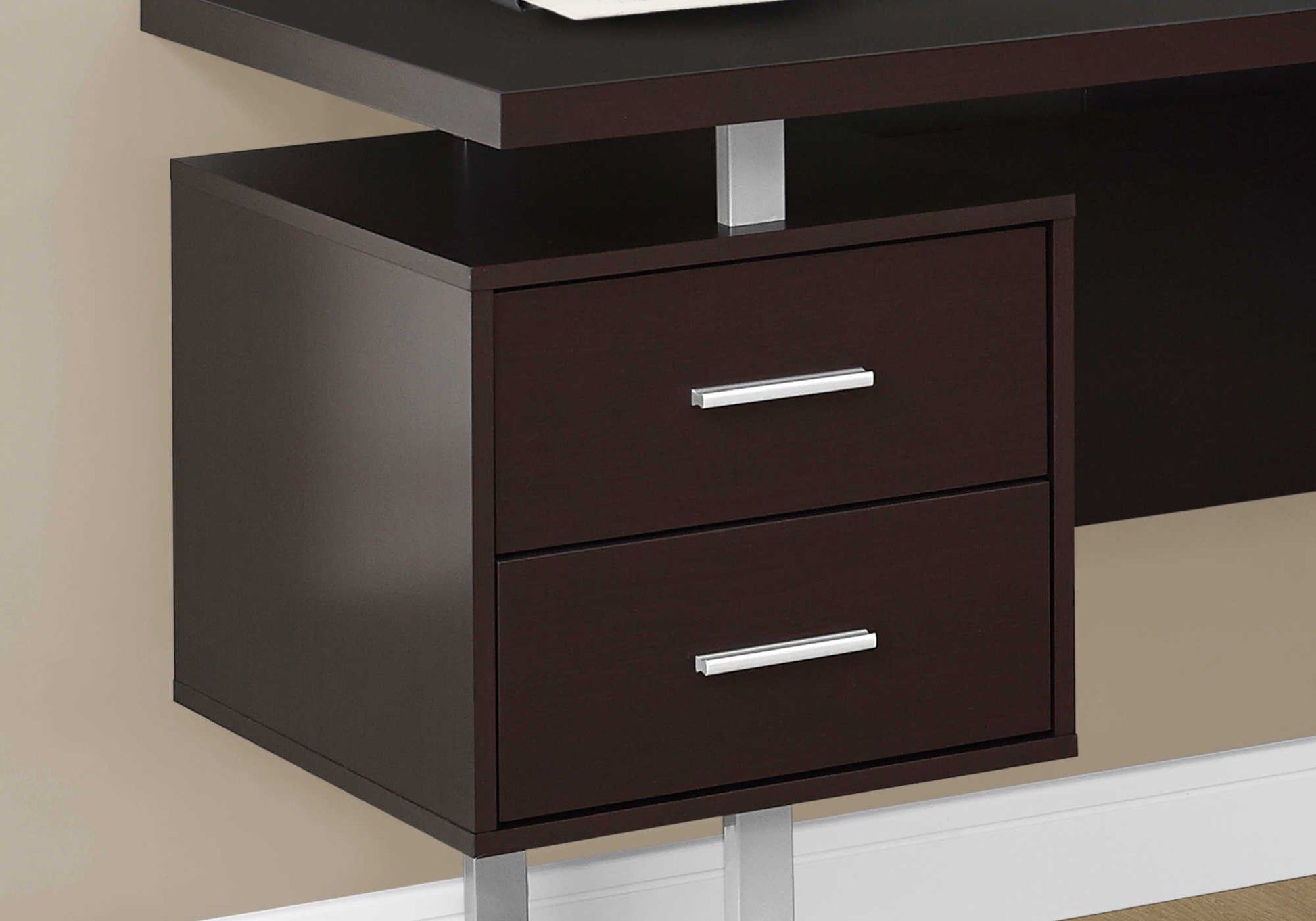 - Bureau d'ordinateur en forme de L avec 3 tiroirs de rangement à panneaux épais au fini espresso brun foncé et 3 pieds en métal robustes au fini argenté