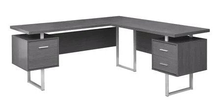 - Bureau d'ordinateur en forme de L avec 3 tiroirs de rangement à panneaux épais au fini gris et 3 pieds en métal robustes au fini argenté