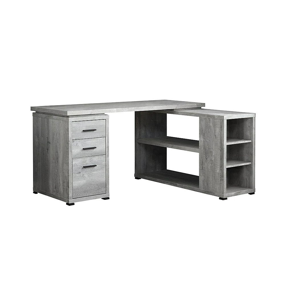 Ce bureau d'angle combine un espace de rangement fonctionnel avec des zones d'affichage élégantes. À gauche se trouve un classeur avec 3 tiroirs de rangement pour ranger de petites fournitures de bureau et des dossiers de format lettre ou légal. A droite se trouve une étagère avec 2 étagères ouvertes qui donnent au bureau une sensation d'aération et 3 casiers orientés vers l'avant, offrant de la place pour les livres et les objets de décoration. Fini en stratifié gris aspect bois recyclé, ce bureau d'ordinateur est doté d'un grand panneau de bureau qui chevauche l'étagère pour créer une deuxième surface de travail légèrement plus basse. Ce bureau d'ordinateur en forme de L permet d'économiser de l'espace lorsqu'il est utilisé dans un coin, mais il est fini sur tous les côtés pour un look poli partout où il est placé dans un bureau à domicile.