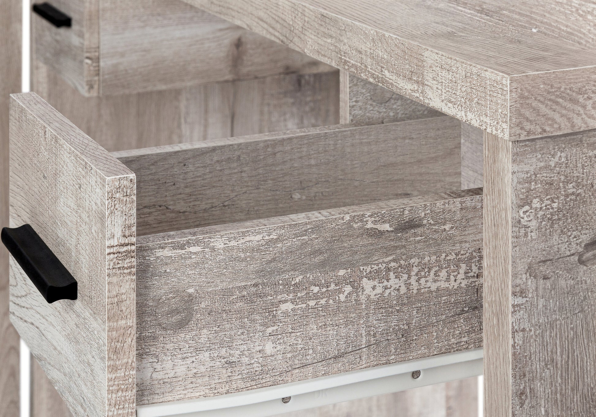 - Bureau d'ordinateur en forme de L avec rangement et une huche avec une construction à panneaux épais dans une finition aspect bois récupéré taupe