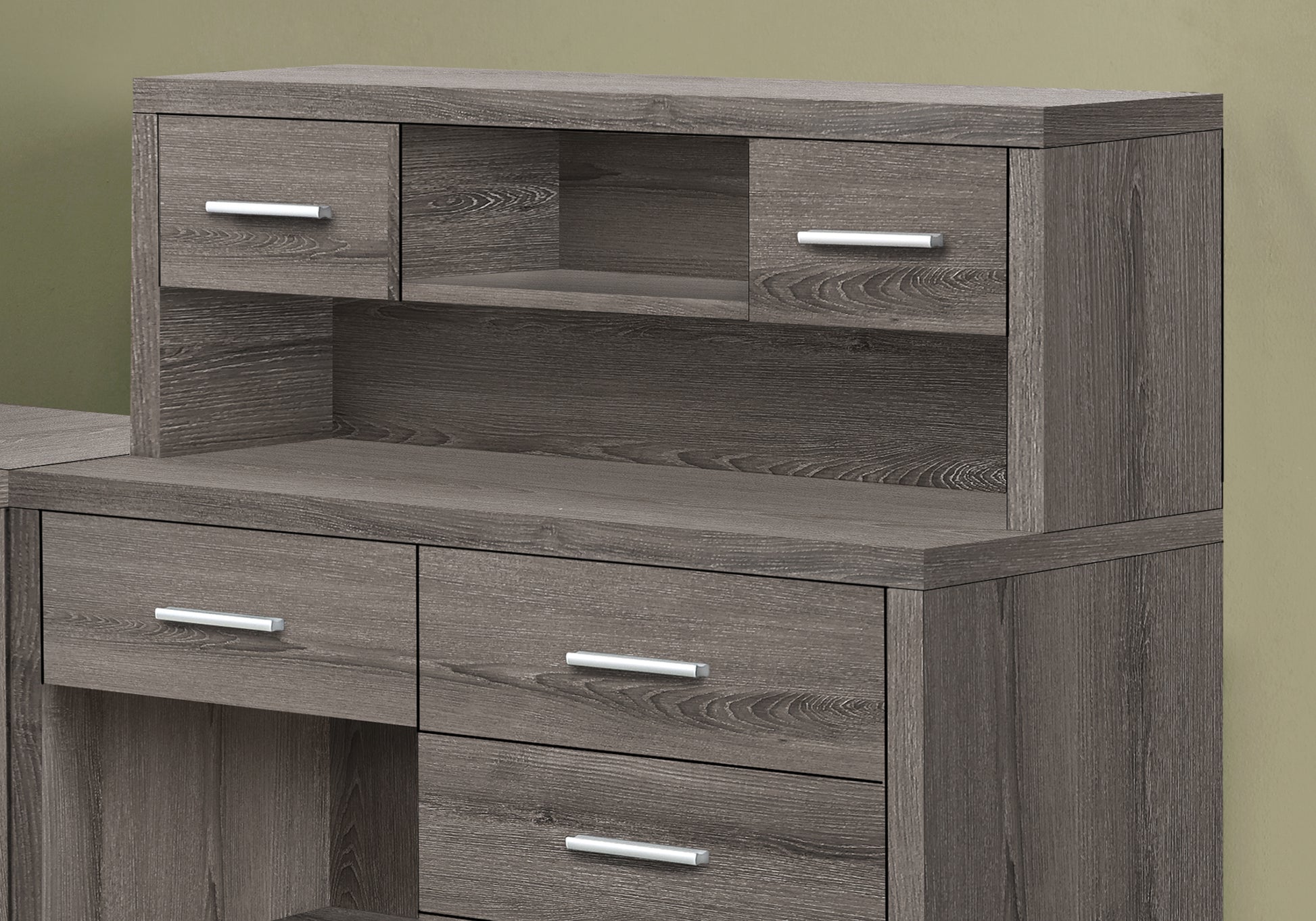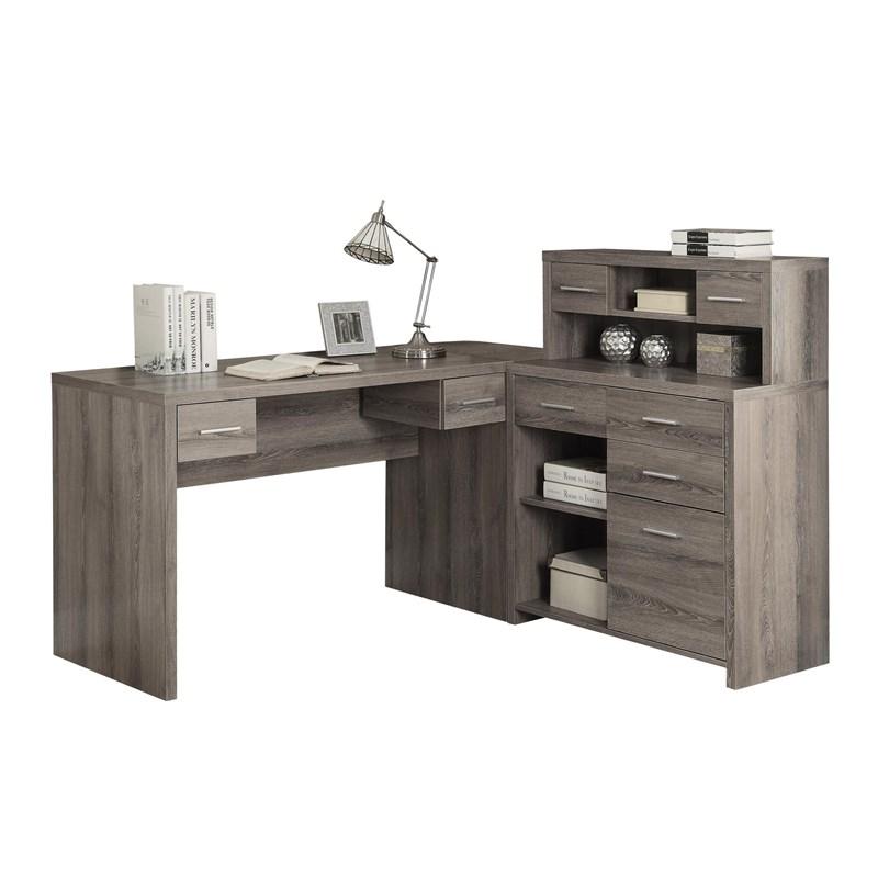 - Bureau d'ordinateur en forme de L avec rangement et huche à panneaux épais dans une finition aspect bois taupe foncé