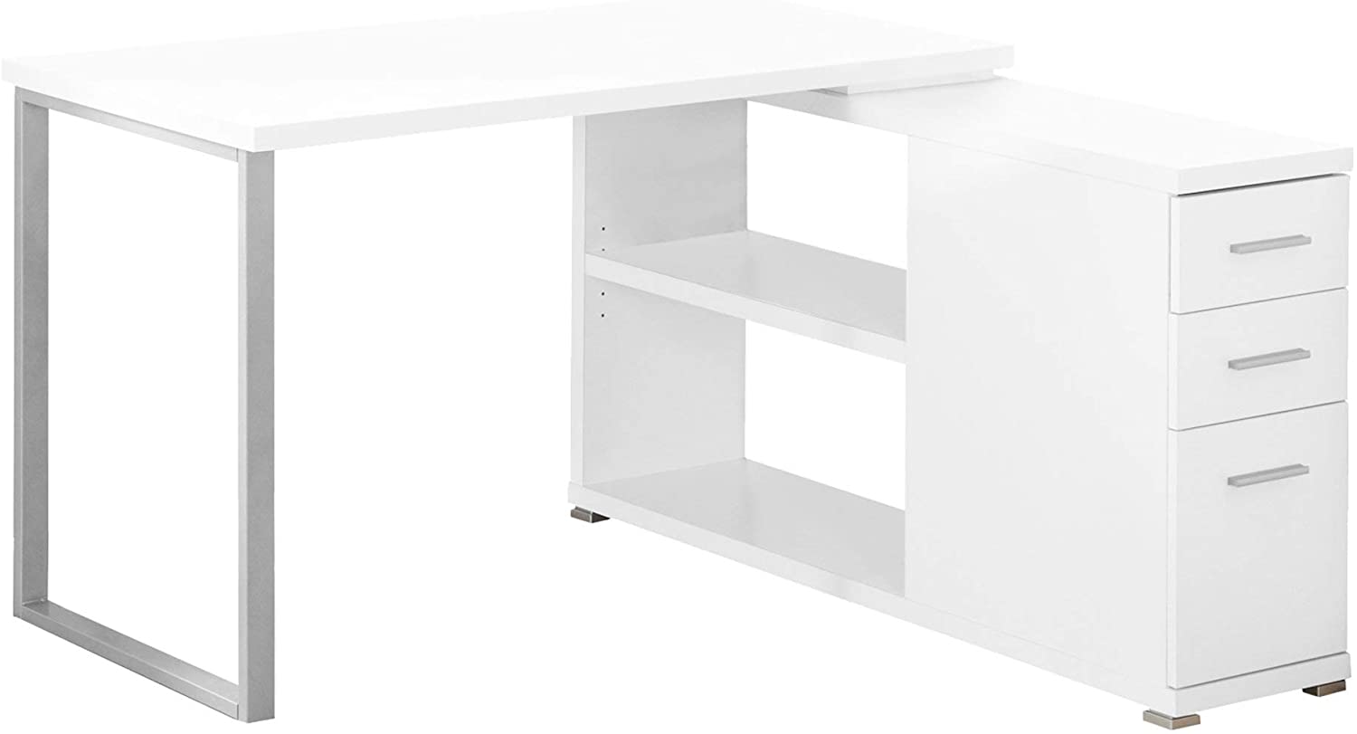 Ce bureau d'ordinateur d'angle au fini blanc est du bon côté du style. Le meuble de rangement de droite comprend 2 étagères ouvertes avec 1 panneau d'étagère réglable et 3 tiroirs de rangement de 2 tailles qui s'ouvrent sur le côté du bureau. À la place des tiroirs de rangement dans la plupart des bureaux en forme de L, un panneau lisse donne à ce bureau un aspect élégant et moderne. Le panneau de bureau principal est soutenu par un pied métallique rectangulaire robuste au fini argenté et chevauche l'unité de rangement pour créer une deuxième surface de travail plus basse. Ce bureau d'ordinateur en forme de L permet d'économiser de l'espace lorsqu'il est utilisé dans un coin, mais il est fini sur tous les côtés pour un look soigné partout où il est placé dans un bureau à domicile.