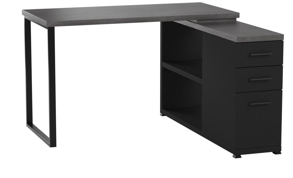 Ce bureau d'ordinateur d'angle noir avec des panneaux de bureau gris est du bon côté du style. Le meuble de rangement de droite comprend 2 étagères ouvertes avec 1 panneau d'étagère réglable et 3 tiroirs de rangement de 2 tailles qui s'ouvrent sur le côté du bureau. À la place des tiroirs de rangement dans la plupart des bureaux en forme de L, un panneau lisse donne à ce bureau un aspect élégant et moderne. Le panneau de bureau principal est soutenu par un pied métallique rectangulaire robuste au fini noir et chevauche l'unité de rangement pour créer une deuxième surface de travail plus basse. Ce bureau d'ordinateur en forme de L permet d'économiser de l'espace lorsqu'il est utilisé dans un coin, mais il est fini sur tous les côtés pour un look poli partout où il est placé dans un bureau à domicile.