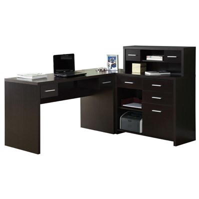 - Bureau d'ordinateur en forme de L avec rangement et huche à panneaux épais au fini espresso brun foncé