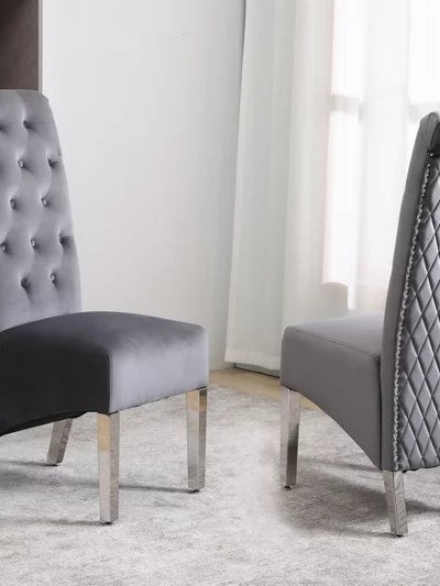 Chaise de salle à manger en velours gris avec coutures à motif de losanges, capitonnage profond, heurtoir de lion, pieds en chrome poli, détails de tête de clou.