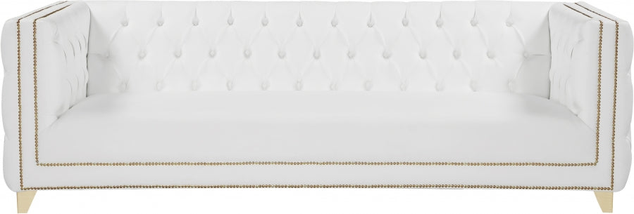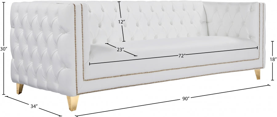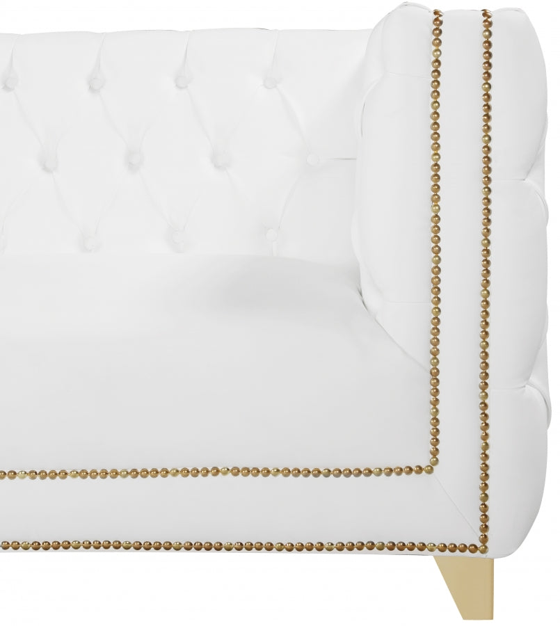 Recouvert de similicuir blanc doux, ce canapé Michelle est somptueusement glamour. Conçue pour un style de vie haut de gamme, cette chaise présente une riche garniture de têtes de clous dorés et des pieds en fer doré qui la maintiennent ancrée dans la beauté contemporaine. Le matériau capitonné couvre chaque pouce de cette unité, et le capitonnage des boutons garantit que l'unité reste dodue et confortable et résiste bien à une utilisation continue. Associez-le à d'autres articles de la collection pour un look cohérent.