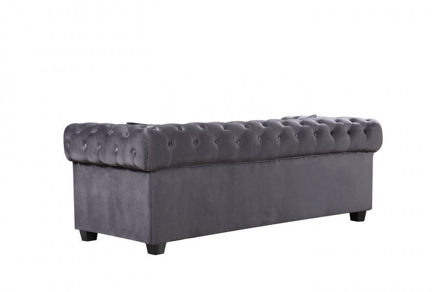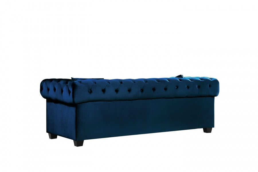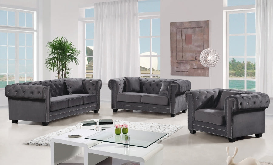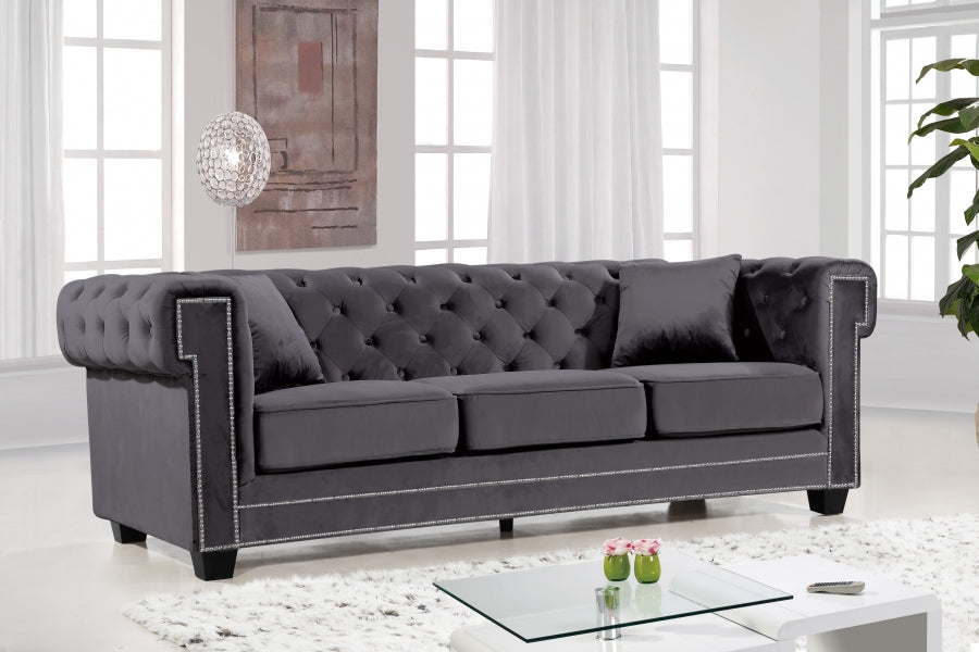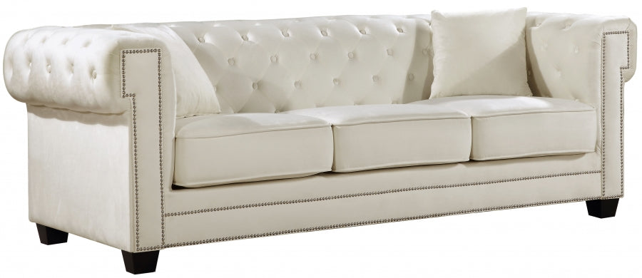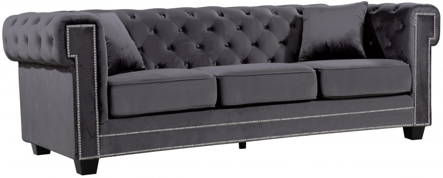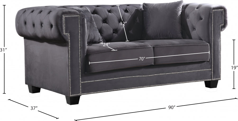 La collection Bowery par Meridian Furniture. Dispose d'un revêtement en velours capitonné magnifiquement conçu avec des pieds en bois personnalisés et une garniture de tête de clou. Cette collection est garantie d'être le point culminant de n'importe quelle maison. Coussins inclus.