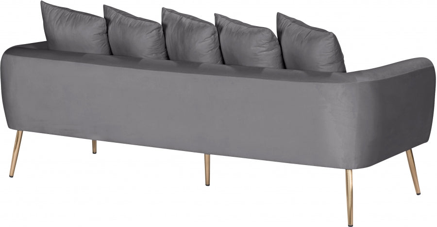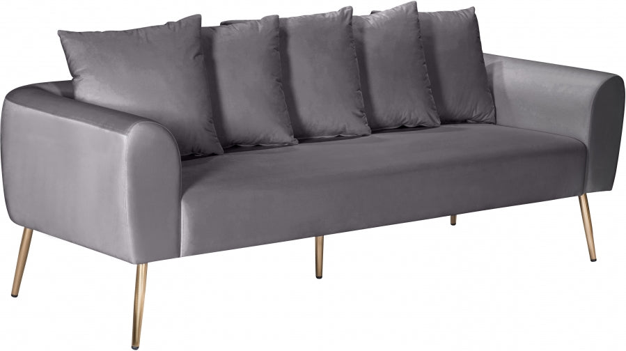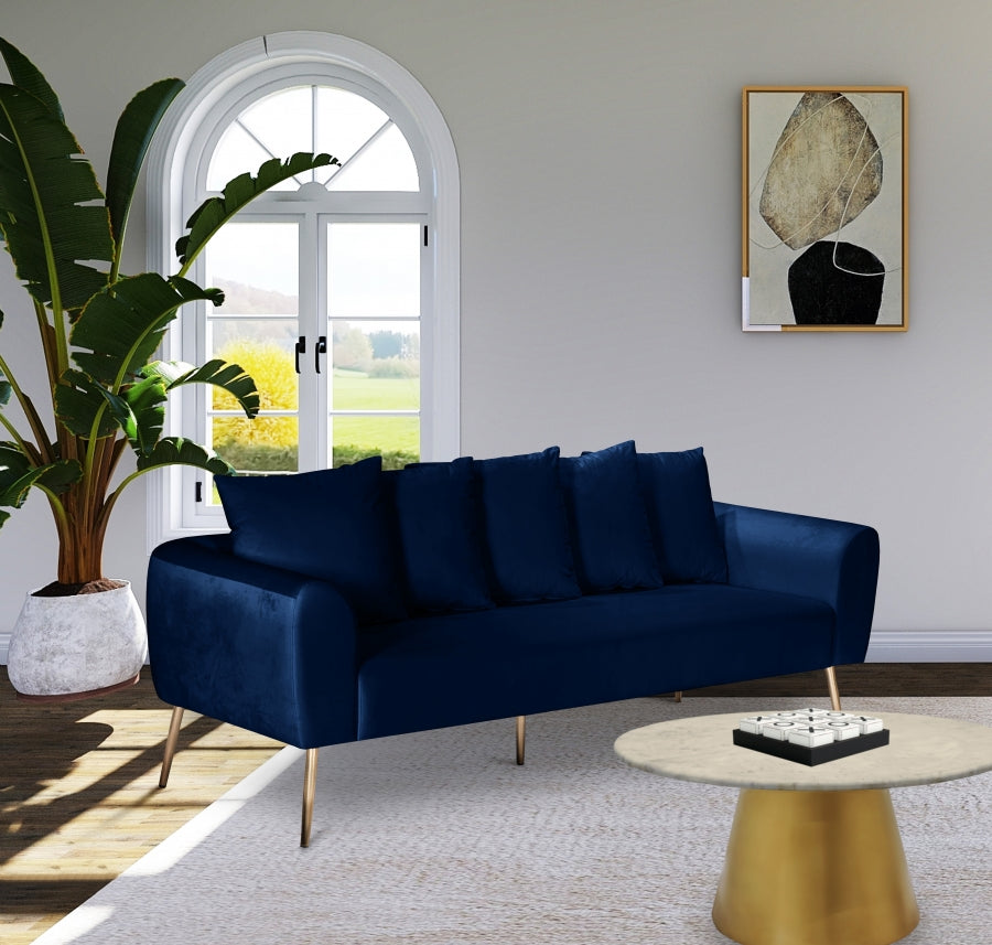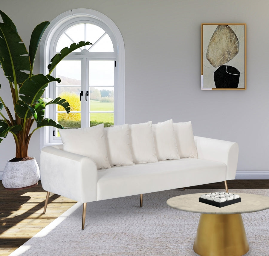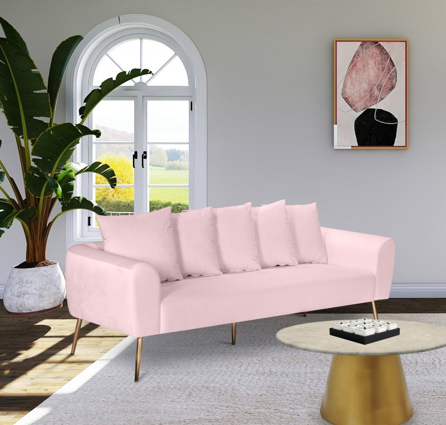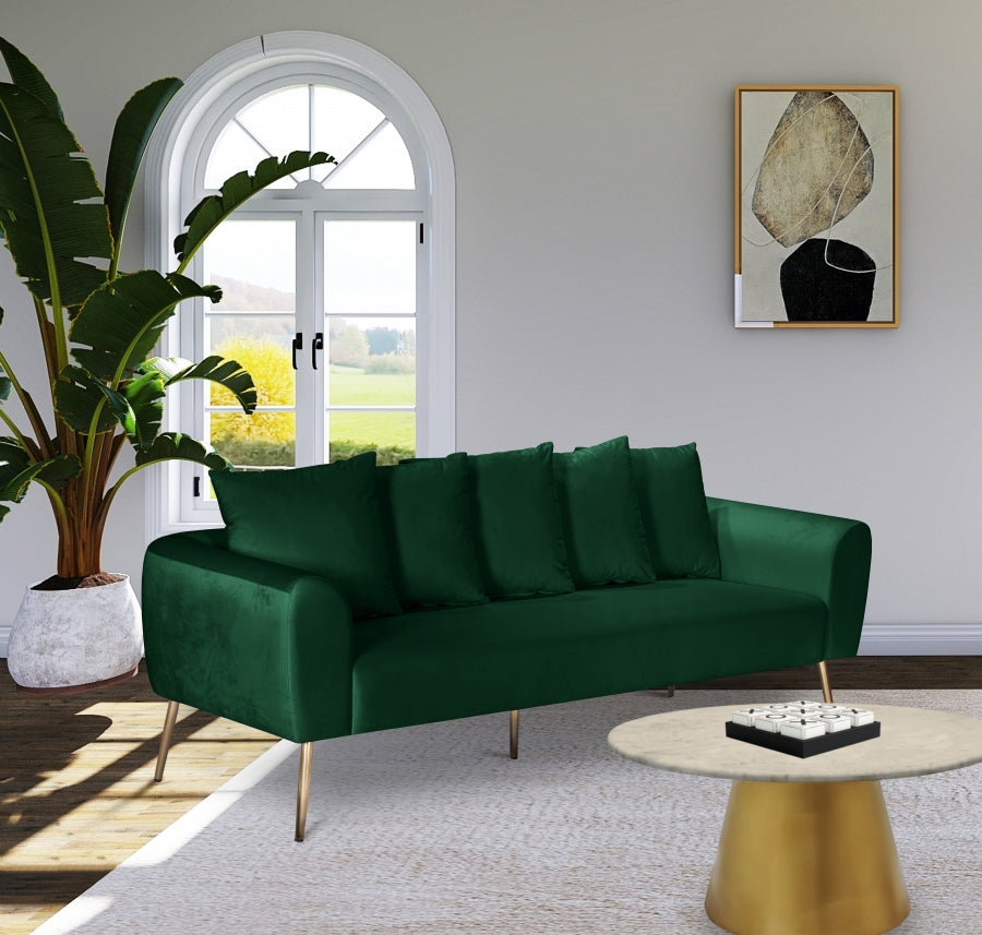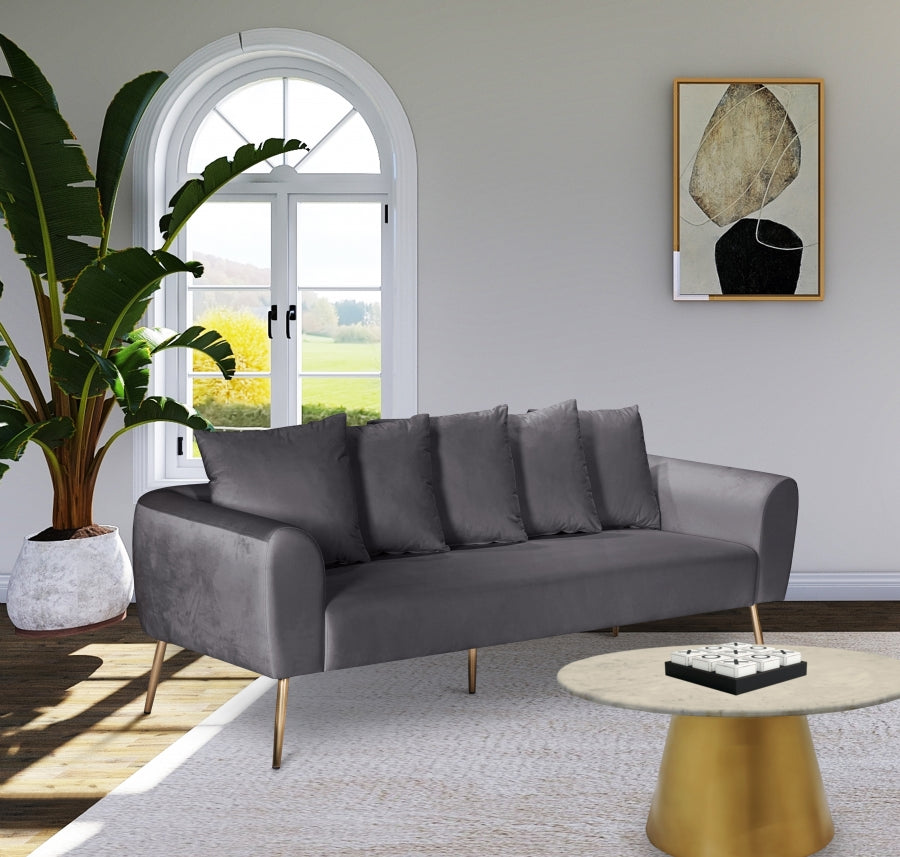Asseyez-vous dans ce canapé en velours Quinn et vous réfléchissez peut-être à deux fois avant de vous relever. Ce canapé super confortable est doté d'un revêtement en velours doux qui recouvre ses effacements, son siège et son dossier abondamment rembourrés, garantissant qu'il est invariablement le meilleur siège de la maison. Les deux coussins assortis ajoutent à son ambiance accueillante, tandis que les pieds en acier doré rendent le design particulièrement moderne.