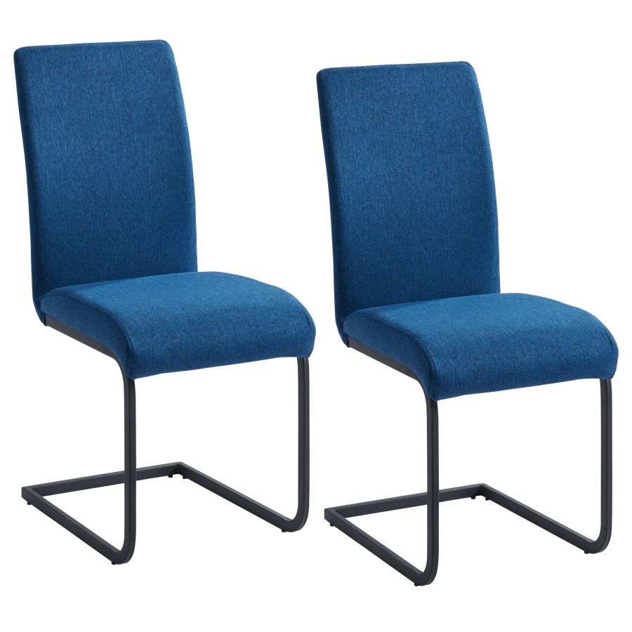 Chaise contemporaine recouverte de tissu avec une structure en métal noir mat. Les courbes subtiles du dossier et de l'assise de la chaise offrent beaucoup de confort. Tandis que la base de style C permet un basculement confortable dans le siège. Mélangez et assortissez avec différents styles et finitions de table pour créer l'espace de salle à manger parfait.