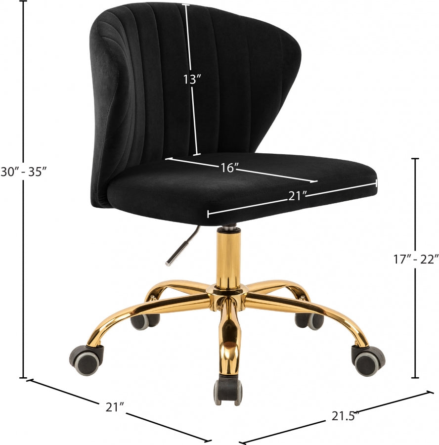 Comptez sur la chaise de bureau en velours Finley pour leur donner de quoi parler autour du mérite d'eau. Cette magnifique chaise de bureau a un dossier svelte inspiré d'un coquillage qui est touffeté pour un look somptueusement invitant et un confort accru pour vous aider à passer ces longues heures enchaînées à votre bureau. Récompensez-vous pour le VIP que vous êtes avec cette chaise recouverte de velours doux qui procure une sensation luxueuse contre la peau, peu importe à quel point vous travaillez fort. La base dorée riche comporte cinq roulettes pour faciliter le déplacement de votre poste de travail à l'imprimante, et cette chaise pivotante est réglable pour plus de confort.