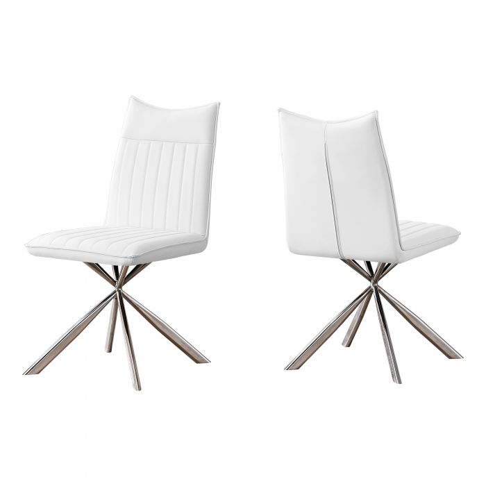Le style hors du commun rencontre le confort terre-à-terre avec ces chaises de salle à manger rembourrées en tissu d'apparence cuir blanc. Des pieds en métal entrecroisés dans une finition chromée pour former un design distinctif en forme d'étoile qui ajoutera une étincelle à votre salle à manger ou à votre cuisine avec coin repas. Le capitonnage à canaux verticaux et le remboursement généreux sur le siège profond et le dossier mi-haut offrent une sensation de luxe tout en offrant un soutien exceptionnel. Vendues en ensemble de 2 pièces, ces chaises élégantes présentent un attrait universel qui les rend idéales pour les salles à manger décontractées ou formelles, ou comme chaises d'appoint dans d'autres pièces.