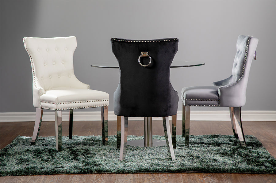 Disponibles en velours gris, velours noir ou similicuir blanc