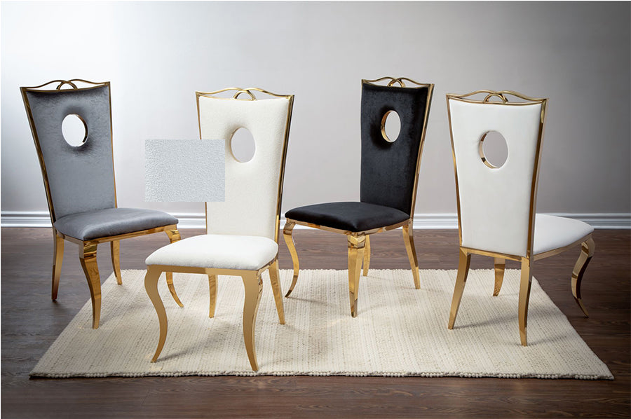 Tissu bouclé blanc, similicuir blanc, velours noir ou velours gris.